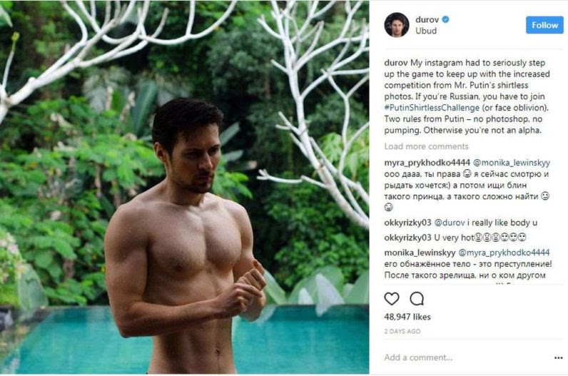 They say he’s more than a man but less than a god. When they say this, of course, they’re talking about Vladimir Putin — king of the shameless outdoor bare-chested, dad bod(ish) photo. Here he is, for example, flipping a judo opponent (without a shirt on); riding a horse (without a shirt on); swimming butterfly (without a shirt on) and tanning by a lake (without a shirt on). (In fairness, the last two make some shirtless sense.) Previously, it was just something Putin caught a lot of shit for, but now it’s this summer’s Russian equivalent of the Ice Bucket Challenge. In that Pavel Durov, the founder of the social networking…